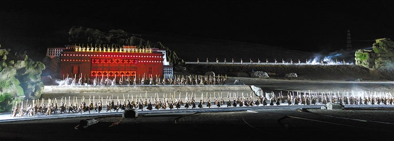 星空為幕,山川為景,氣勢(shì)恢宏,震撼心靈。直抵人心的音樂(lè)聲響起,歡快的果卓鼓聲震天,熱情的篝火升騰;打阿嘎的搗地之聲,古老藏戲的婉轉(zhuǎn)傳唱,甲諧的豪情奔放……恢弘的布達(dá)拉宮布景前,“文成公主”和“松贊干布”穿越千年而來(lái),再現(xiàn)漢藏和美的動(dòng)人傳奇。