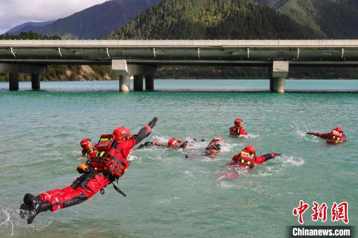 圖為林芝森林消防指戰(zhàn)員在尼洋河進(jìn)行平跳式入水訓(xùn)練。楊永龍 攝