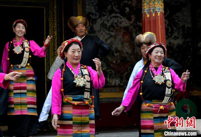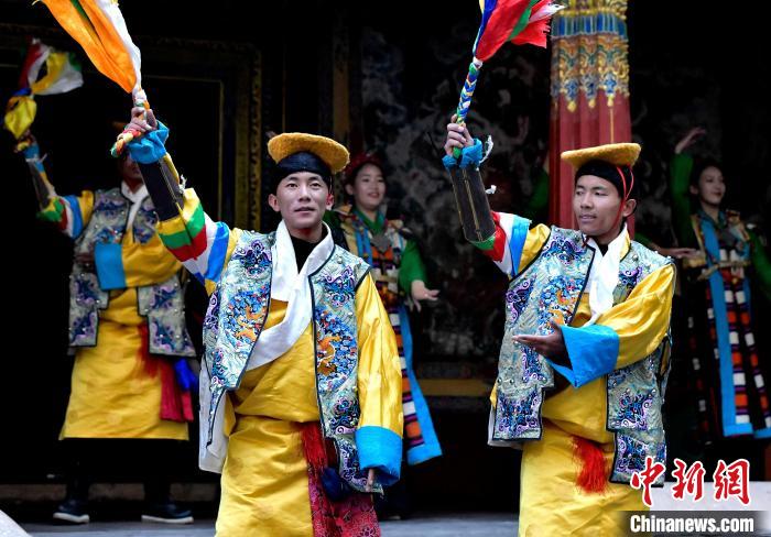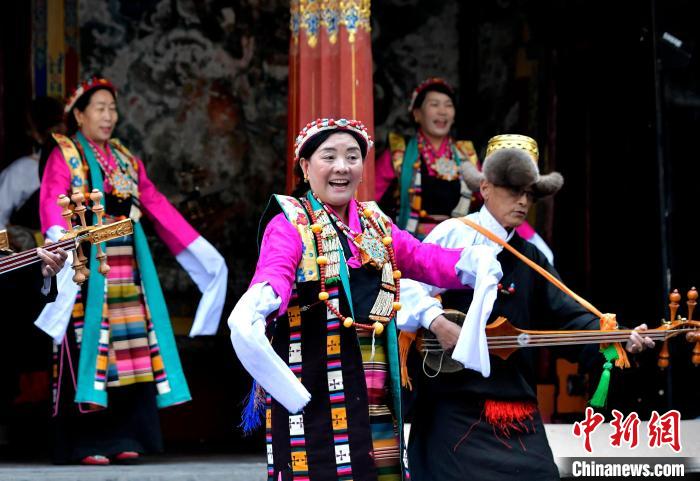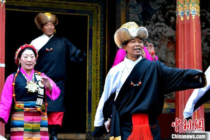 據(jù)悉,堆諧最早流傳于日喀則,是由扎念琴樂器伴奏的舞蹈。扎念琴是堆諧“邊彈、邊唱、邊舞”表演風(fēng)格形成的關(guān)鍵。作為日喀則市桑珠孜區(qū)的重要非遺項(xiàng)目之一,堆諧以其獨(dú)特的表演形式,受到了眾多觀眾的喜愛。日喀則市諧欽則起源于1883年,其韻調(diào)古樸,表現(xiàn)獨(dú)特,顯示出濃郁的西藏風(fēng)景和鮮明的地方特色。諧欽演員們精湛的表演技藝、華麗的戲服,將古老的西藏歌舞藝術(shù)完美呈現(xiàn)在這座古建筑前。