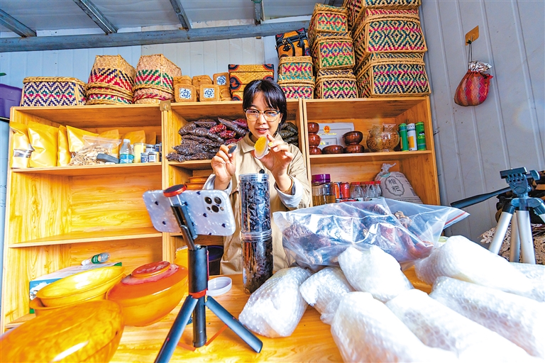 圖為日喀則市吉隆縣吉隆鎮(zhèn)吉甫村村民朗薩通過電商平臺銷售當?shù)靥禺a(chǎn)。記者 格桑吉美 攝