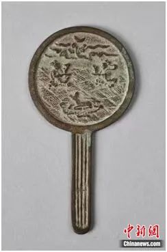 國家民委主辦的“鑄牢中華民族共同體意識文物古籍展”正在民族文化宮展出。圖為展覽中展出的以中原文化紋樣為飾的金銅鏡。民族文化宮供圖