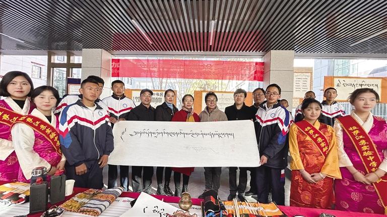 隨后,與會領(lǐng)導(dǎo)向江蘇實驗中學(xué)贈送了150套民族團結(jié)進步教育讀本。大家一同觀看了書畫社同學(xué)現(xiàn)場進行的民族團結(jié)進步書畫作品創(chuàng)作。中國書協(xié)會員、自治區(qū)政協(xié)委員、拉薩市政協(xié)常委、區(qū)市書協(xié)副主席南杰旺扎現(xiàn)場創(chuàng)作了“鑄牢中華民族共同體意識”的藏文書法橫幅贈送給江蘇實驗中學(xué)。