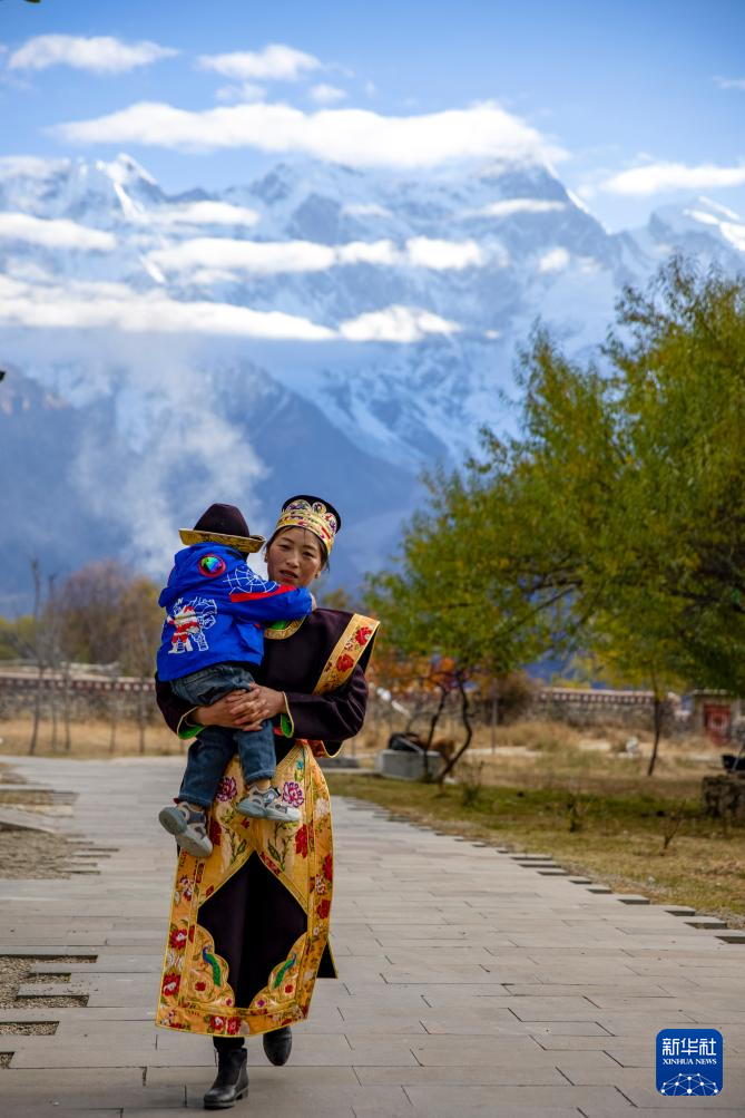 工布新年的大年初一,拉巴卓瑪和兒子端著寓意五谷豐登的“切瑪”在家門(mén)口祈福(11月14日攝)。新華社記者 姜帆 攝