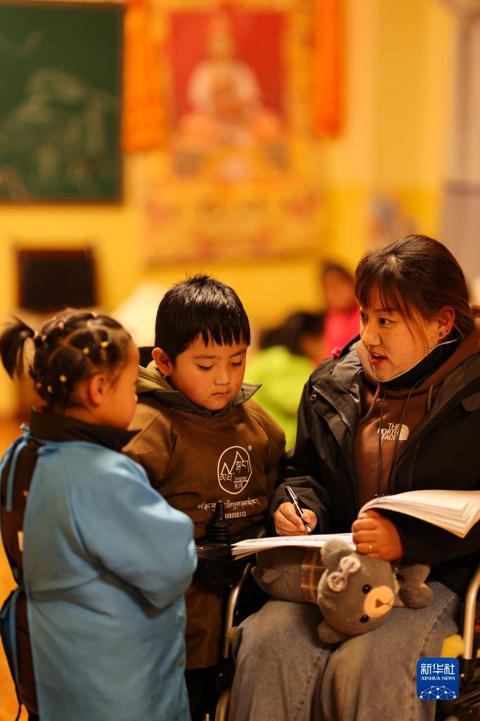 卓嘎在藏文書(shū)法班上輔助老師上課(12月2日攝)。新華社記者 晉美多吉 攝