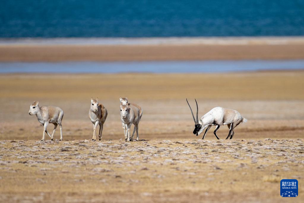 在羌塘國家級自然保護區(qū),一只贏得交配權的雄性藏羚羊守護著自己的“后宮”(12月16日攝)。新華社記者 姜帆 攝