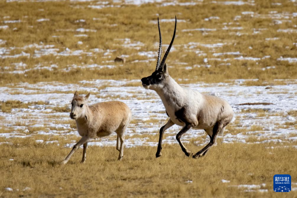 在羌塘國家級自然保護區(qū),一只雄性藏羚羊在奔向雌性(12月16日攝)。新華社記者 姜帆 攝
