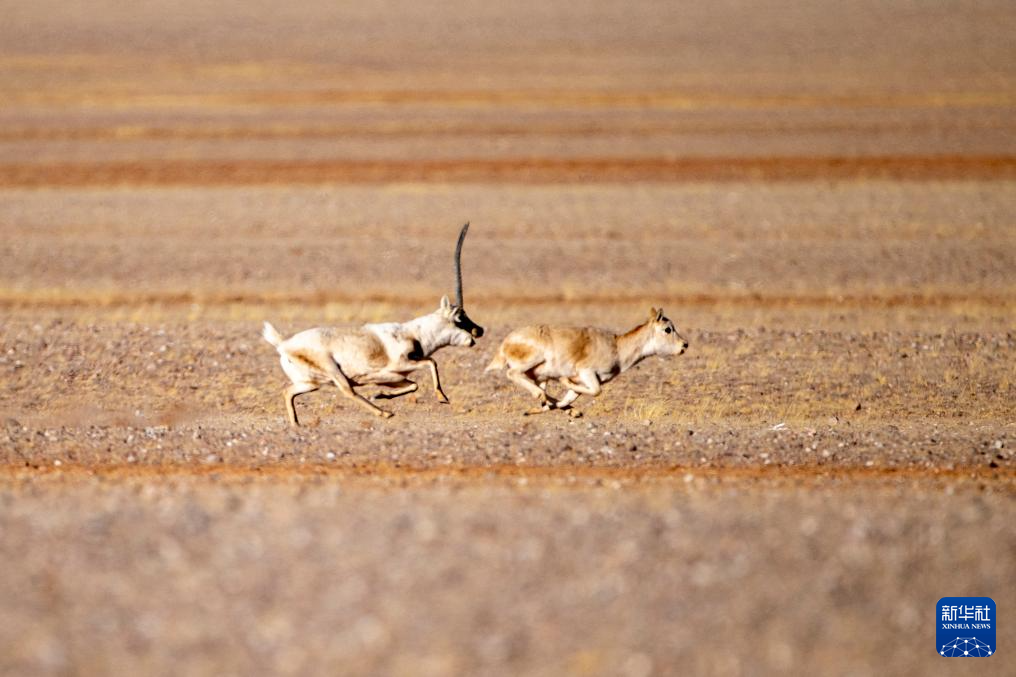 在羌塘國家級自然保護區(qū),兩只雄性藏羚羊在追逐雌性(12月16日攝)。新華社記者 姜帆 攝