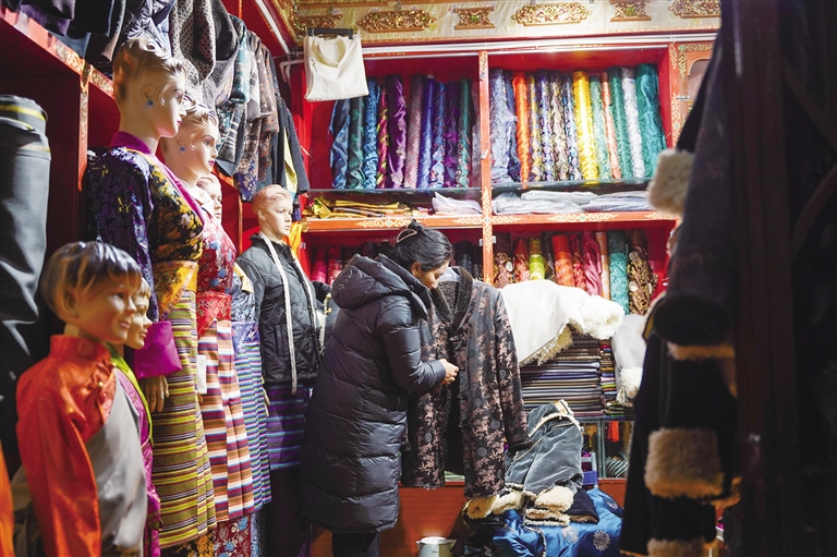 “最近來做冬款藏裝的人挺多的,大部分都是本地居民?!钡曛骷诮榻B,中老年人常穿的款式是無袖深色和單色的“特瑪”料子藏裝,年輕人則喜愛傳統(tǒng)和潮流兼?zhèn)涞牟匮b。同時,隨著旅游業(yè)的發(fā)展和各民族文化交流加深,很多游客也開始購買藏裝,“以前游客都是春夏買藏裝,但是現(xiàn)在也有一些游客會買冬裝。”吉宗說,大多數(shù)游客一開始普遍喜愛花色眾多、顏色亮麗的綢緞料子,慢慢會比較偏向純色、傳統(tǒng)藏裝。
