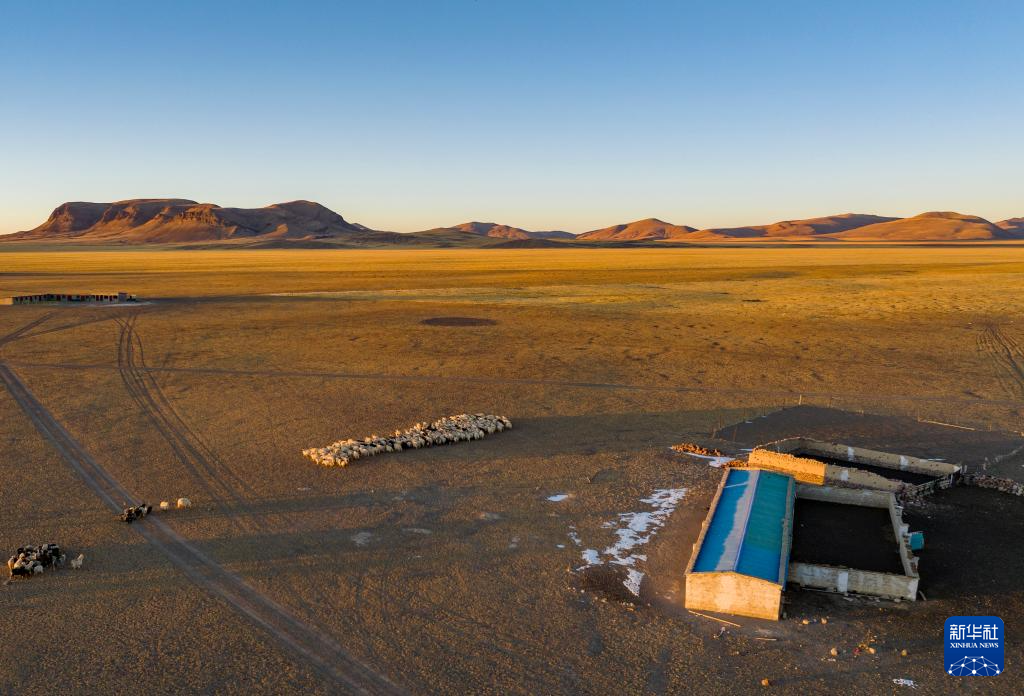 太陽(yáng)落山,丹增家的羊回到棚圈。其中左側(cè)藍(lán)頂?shù)氖侨ツ晷律w的封閉式棚圈,右側(cè)是傳統(tǒng)的敞開式羊圈(無(wú)人機(jī)照片,12月18日攝)。新華社記者 姜帆 攝