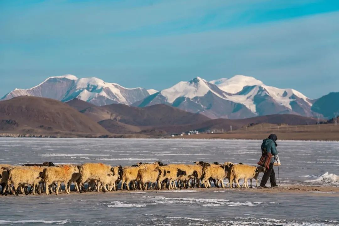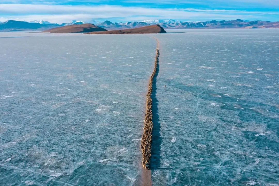 它是世界上海拔最高的村落之一,當(dāng)?shù)卮迕穸家苑拍翞樯:瑏砼R,岸上的牧場草料已經(jīng)不夠羊群過冬,推瓦村的村民們把羊群集結(jié)在一起,在冰湖上撒牛糞爐灰,畫出一道冰面上的“羊腸小道”把羊群趕上普姆雍錯(cuò)湖心島上吃草過冬,雖然只有幾公里的距離,但這個(gè)傳承千年的畫面卻給人以史詩般的震撼與感動。