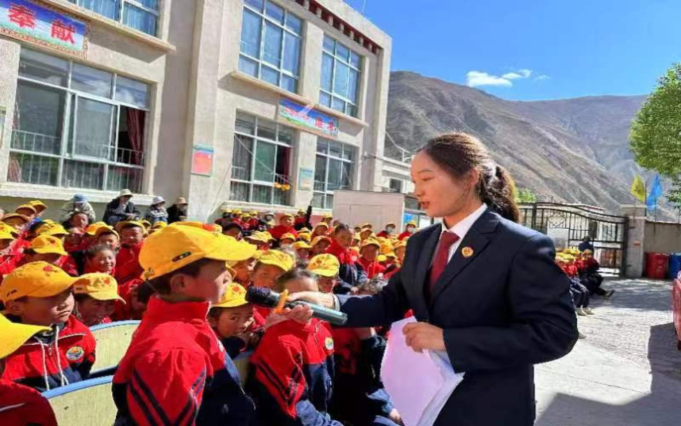 2023年“六一”國際兒童節(jié),尼木縣人民檢察院黨組書記、檢察長德吉桑姆帶領“文香·藍”法律宣傳服務隊前往帕古鄉(xiāng)完小開展法治進校園活動。
