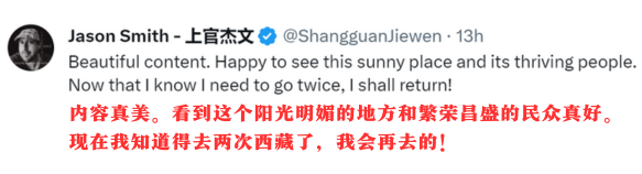 此外,新西蘭媒體人安柏然、《沙特阿拉伯新聞》記者賈邁勒·杜巴希、愛(ài)沙尼亞-中國(guó)商會(huì)主席達(dá)維德·維克托、美國(guó)反戰(zhàn)人士克里斯蒂·富蘭克林,我駐馬爾代夫大使館和駐意大利、英國(guó)、巴基斯坦外交官轉(zhuǎn)贊評(píng),紛紛對(duì)西藏的美麗景色和深厚文化表示贊賞。