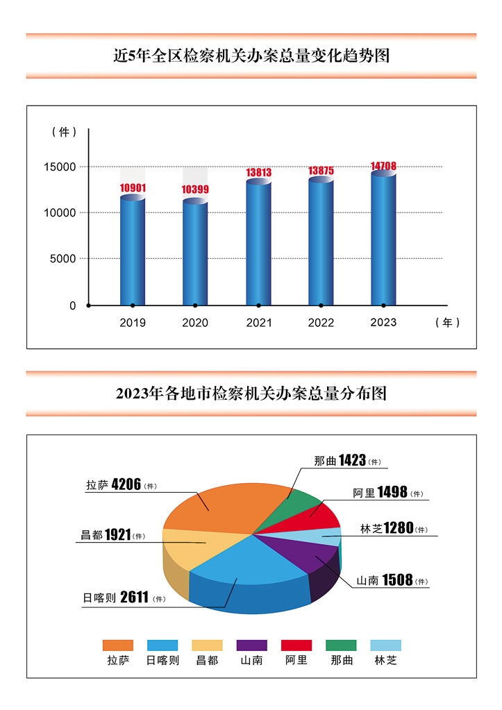 “2023年,全區(qū)檢察機關(guān)在自治區(qū)黨委和最高檢正確領(lǐng)導(dǎo)下,以習(xí)近平新時代中國特色社會主義思想為指導(dǎo),深入貫徹習(xí)近平法治思想、習(xí)近平總書記關(guān)于西藏工作的重要指示和新時代黨的治藏方略,全面貫徹黨的二十大精神、自治區(qū)第十次黨代會和十屆區(qū)黨委歷次全會精神、全國檢察長會議精神,認真落實自治區(qū)十二屆人大一次會議決議,自覺把檢察工作放到黨的治藏穩(wěn)藏興藏大局中謀劃推進,聚焦‘四件大事’聚力‘四個創(chuàng)建’,忠誠依法能動高質(zhì)效履職取得新成效。全年辦理各類法律監(jiān)督案件14708件,同比增長6%。依法主動辦案8030件,占54.6%,主動辦案量首次超過被動受理案件量?!拇髾z察’結(jié)構(gòu)持續(xù)優(yōu)化為56∶18∶7∶19,業(yè)務(wù)質(zhì)效穩(wěn)步提升。”1月8日下午,西藏自治區(qū)人民檢察院檢察長夏克勤在西藏自治區(qū)第十二屆人民代表大會第二次會議上作工作報告。報告全面反映了西藏檢察機關(guān)一年來始終牢記“國之大者”,以實現(xiàn)“努力讓人民群眾在每一個司法案件中感受到公平正義”為目標(biāo),深入踐行“高質(zhì)效辦好每一個案件”,充分發(fā)揮檢察職能作用,在為大局服務(wù)、為人民司法、為法治擔(dān)當(dāng)中所做的主要工作,同時描繪了2024年的西藏檢察工作藍圖。