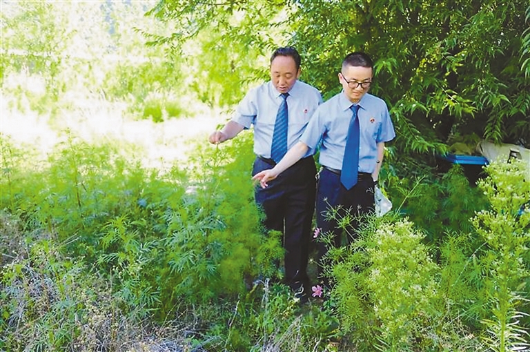 朗縣人民檢察院在辦理督促防治外來物種印加孔雀草行政公益訴訟案期間,檢察官對印加孔雀草的生長區(qū)域進行摸排。