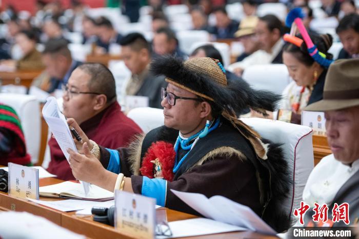 1月6日,西藏自治區(qū)兩會現場,珞巴族政協委員林勇(中間者)參會。中新社記者 貢嘎來松 攝