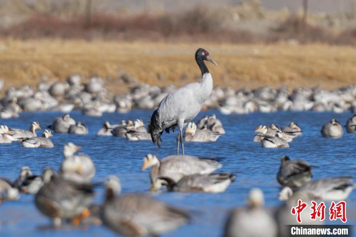 1月10日,西藏雅魯藏布江中游河谷黑頸鶴國家級自然保護區(qū)日喀則片區(qū)拉孜縣曲瑪鄉(xiāng)境內(nèi),大量越冬的黑頸鶴翩翩起舞,在濕地和農(nóng)田間覓食、嬉戲。近年來,隨著國家加大青藏高原生態(tài)保護力度,西藏多措并舉實施生態(tài)建設(shè),廣大農(nóng)牧民民眾保護野生動物的意識不斷提升,黑頸鶴及其棲息地得到了較好的保護,黑頸鶴數(shù)量逐年遞增。據(jù)悉,每年11月至次年3月,日喀則市拉孜縣、謝通門縣、桑珠孜區(qū)等地都會有黑頸鶴在此棲息過冬,最高數(shù)量達到8000只左右。