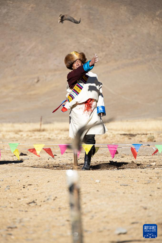 思古龍村的一位村民在投擲牛角(1月13日攝)。新華社發(fā)(丁增尼達(dá) 攝)