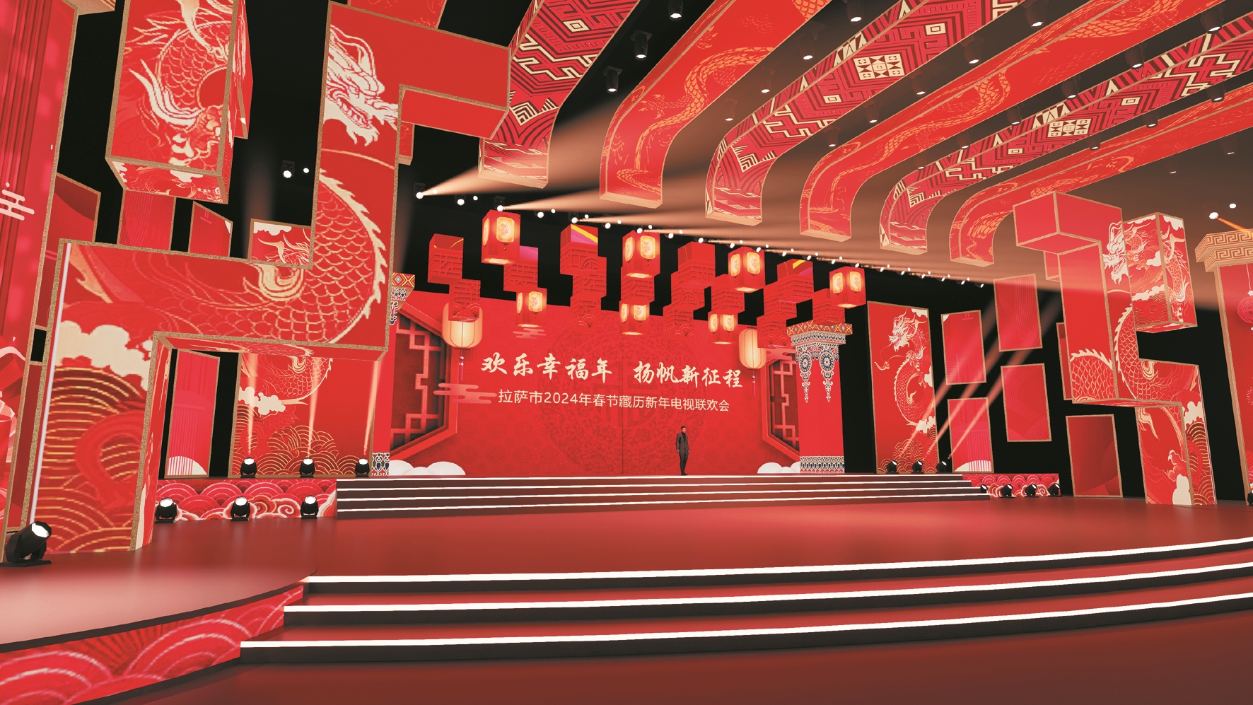 拉薩市2024年春節(jié)、藏歷木龍新年電視聯歡會舞臺效果圖。 (拉薩藏晚劇組供圖)