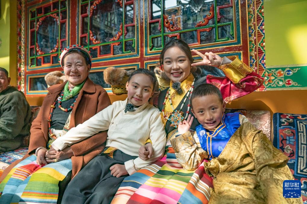 后來我們又去莫拉家拍攝了團圓飯、換新藏裝等場景。拍攝時,我需要穿藏裝和巴桑莫拉的女兒進行互動,而當(dāng)天日喀則的氣溫已經(jīng)到了零下,她發(fā)現(xiàn)我的雙手冰涼后,全程都用自己的手捂著我的手,想讓我暖和一點。拍攝結(jié)束以后,小朋友們也圍在我身邊抱著我,想用自己的方式給我傳遞一點溫暖。