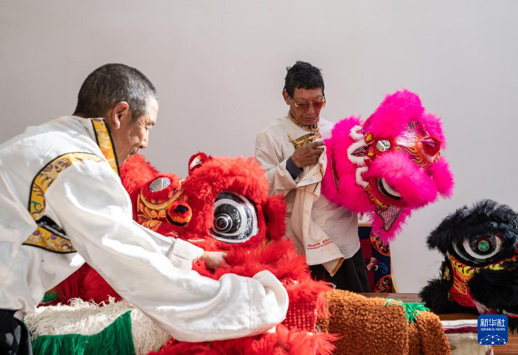 過去,鄧巴阿尼自己動手,用布料和膠水做出獅頭,再給毯子縫上草繩編的毛發(fā)做成獅皮?!昂髞砩顥l件慢慢變好,政府也給了很多支持,我們不僅有錢購買舞獅道具,還有機會去各地表演?!编嚢桶⒛嵴f。2022年,由獅子舞改編的節(jié)目《吉韻碩督》登上了西藏電視臺的藏歷新年聯(lián)歡晚會。2023年,鄧巴阿尼和村民們又將獅子舞搬上了中國西藏旅游文化國際博覽會昌都館的舞臺。