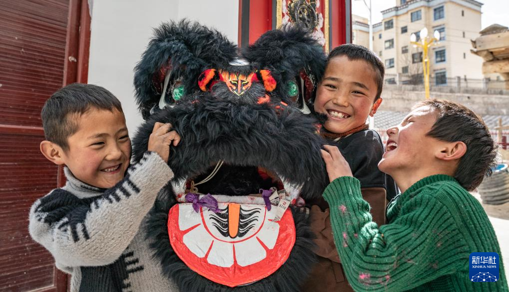 1月19日,在西藏昌都市洛隆縣碩督鎮(zhèn)碩督村,孩子們手捧獅子舞道具玩耍。新華社記者 丁增尼達 攝