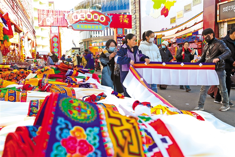 圖為當(dāng)?shù)厥忻裨谫?gòu)買香布。記者 洛桑 通訊員 次仁龍布 攝