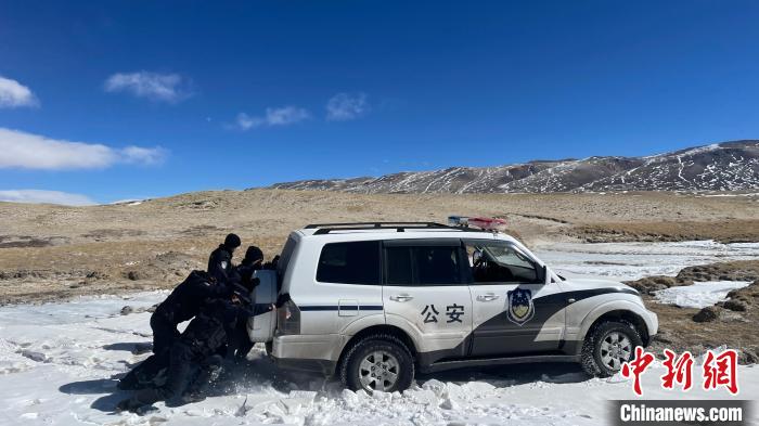 又經(jīng)歷一次陷車后,車輛實(shí)在無法前行。簡單吃過自熱午餐后,民警一行帶好裝備開始“步巡”,凜冽的寒風(fēng)似是帶著刀子般往骨頭里鉆,雪地反射的光讓人睜不開眼,此時(shí)海拔已將近5000米,氣溫零下23攝氏度。