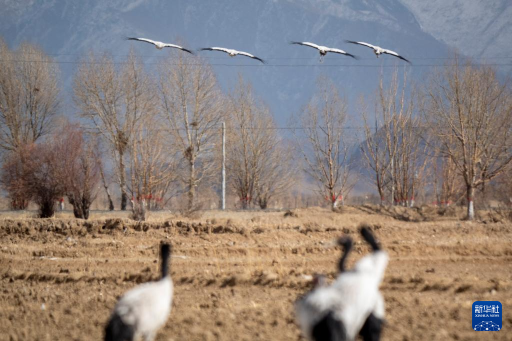 這是1月27日在西藏南木林縣艾瑪鄉(xiāng)田間拍攝到的黑頸鶴。新華社發(fā)(旦增努布攝)