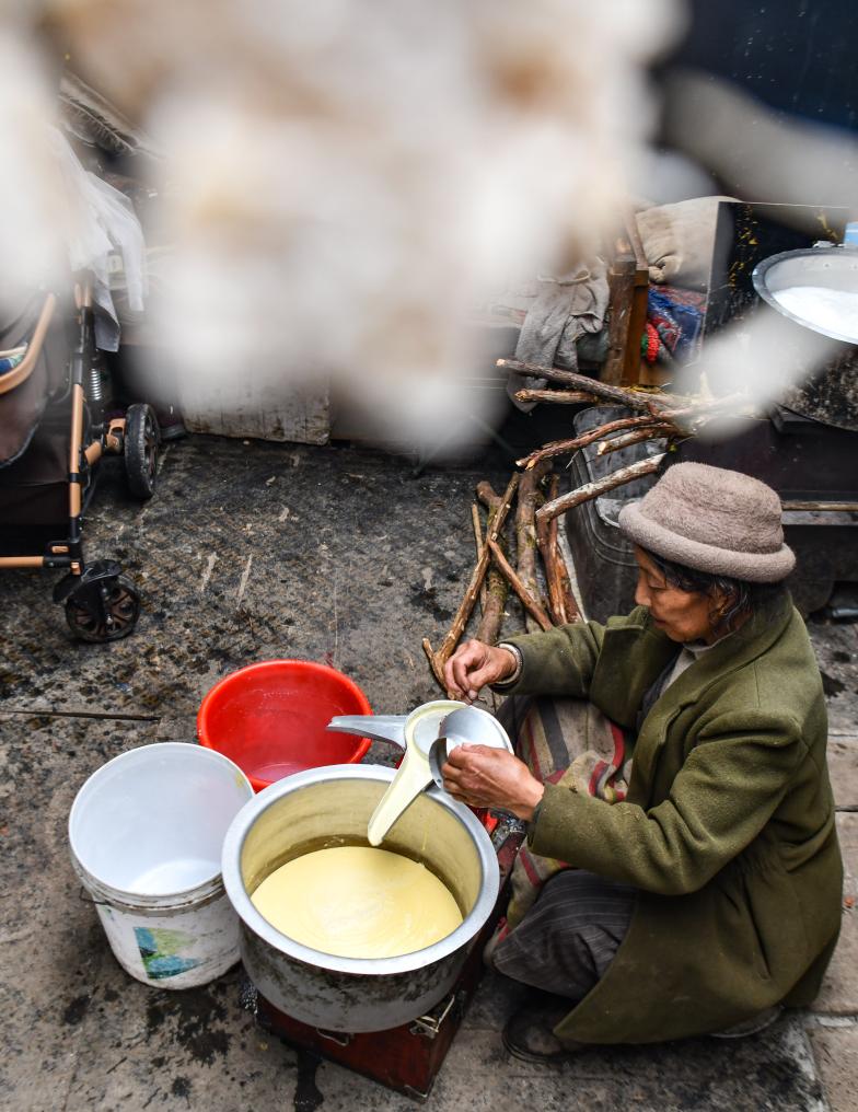 我甚至覺得,我們的到來,對于白瑪?shù)录驄D來說,打亂了他們的生活節(jié)奏。每次我將鏡頭對準(zhǔn)白瑪?shù)录臅r候,她總會微微一笑,甚至有些不好意思再忙碌下去。每到這個時候,我總要說上幾句:“沒事兒,您忙您的,不用管我。”他們才肯接著干手頭上的活兒。對于平靜地生活在山村里的這對夫婦來說,教會他們自然地面對我的鏡頭,似乎是一件很艱巨的任務(wù)。
