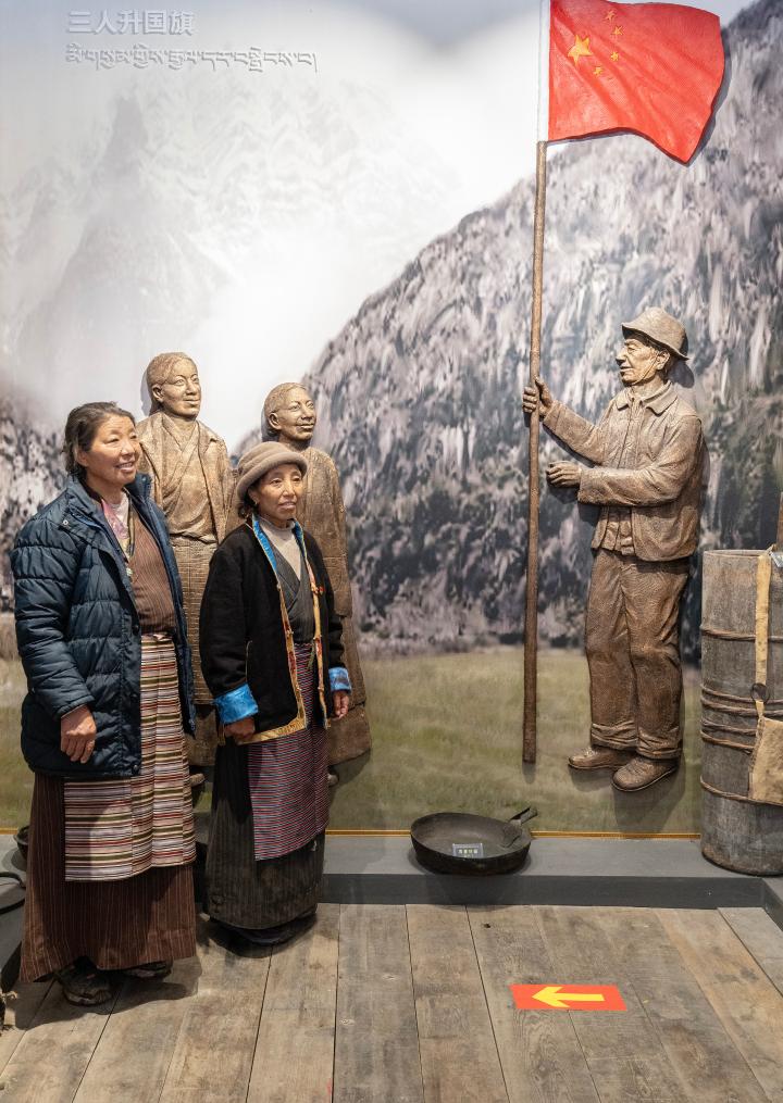2023年6月10日,卓嘎(右)和央宗在桑杰曲巴故居中與描繪桑杰曲巴用自己縫制的國旗舉行升旗儀式場景的壁畫前合影。新華社記者 費茂華 攝