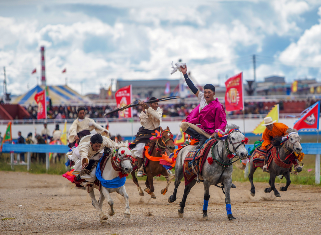 2023年8月10日,騎手在那曲市恰青賽馬節(jié)上進行馬術(shù)表演。