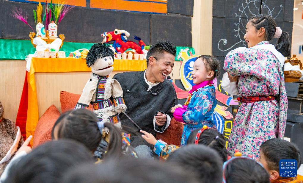 2月3日,手偶表演演員在拉薩的兒童藏裝派對上和孩子們互動。新華社記者 丁增尼達(dá) 攝