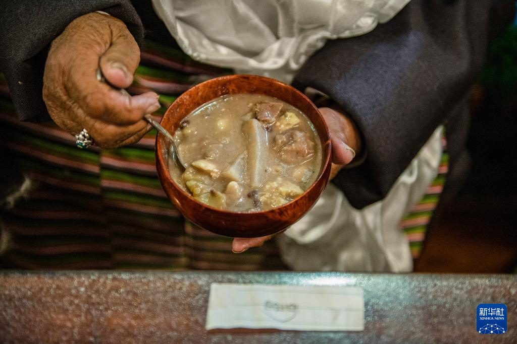 在位于西藏拉薩市當雄縣公塘鄉(xiāng)甲根村的家中,斯曲旺姆的兒子索朗羅達為母親端上“古突”(2月8日攝)。新華社記者 孫非 攝