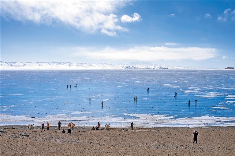 圖②:日前,游客在結(jié)冰的納木錯湖面上游玩。新華社記者 孫非 攝