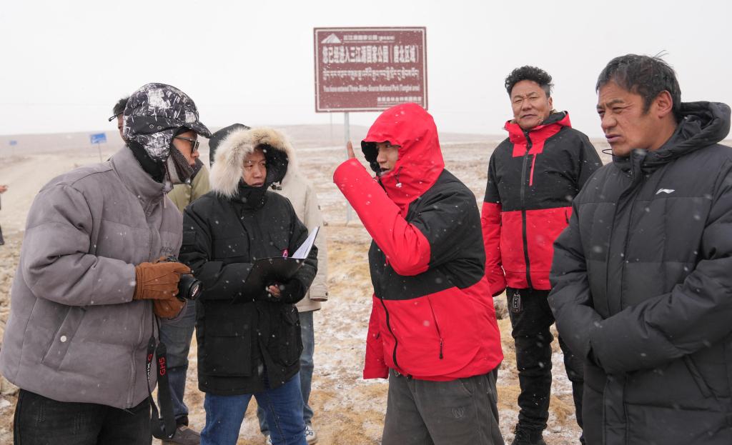 新華社記者(左二)在三江源國(guó)家公園(唐古拉山北部片區(qū))采訪(fǎng)。新華社記者 晉美多吉 攝