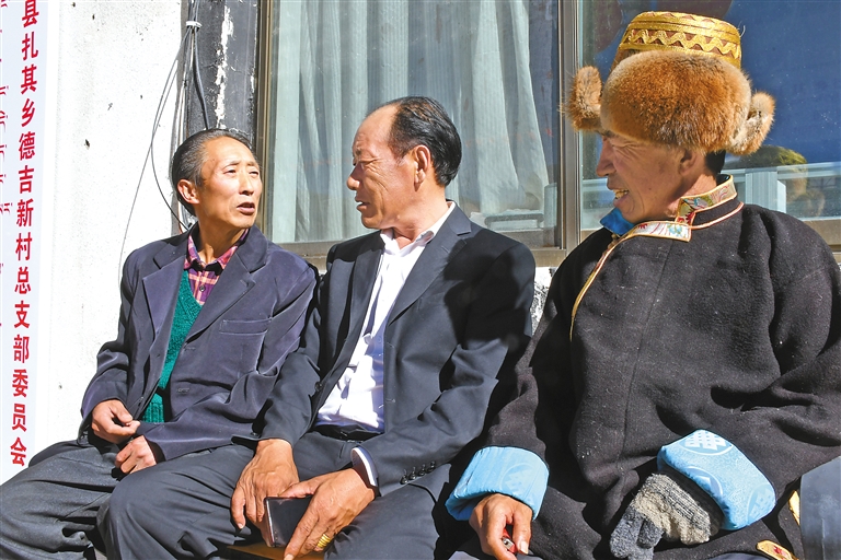 扎囊縣扎其鄉(xiāng)德吉新村,生活著藏族、漢族、土族等不同民族790余名群眾,該村先后榮獲縣級民族團結(jié)進步模范集體、山南市民族團結(jié)進步模范單位、自治區(qū)民族團結(jié)進步模范村(居)等稱號,是山南市遠近聞名的“團結(jié)村”。 圖為在德吉新村村委會大院內(nèi),祖籍青海,身著藏裝的村民張積成(右一),與同村不同民族的群眾一起交談。記者 丹增平措 攝