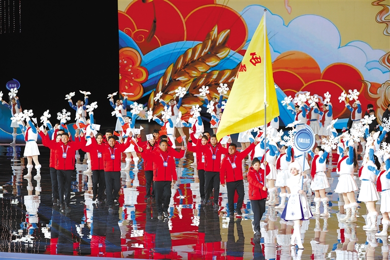 圖為西藏代表團(tuán)亮相第十四屆全國冬季運(yùn)動(dòng)會(huì)開幕式。洛桑 索朗群培 攝
