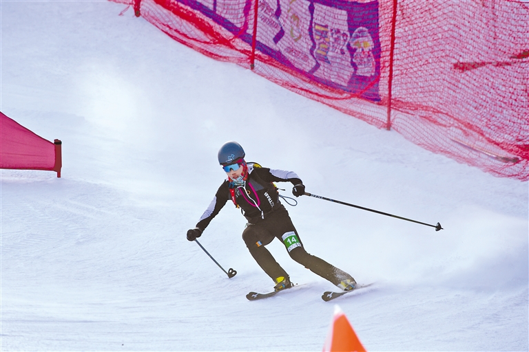 此次比賽共有兩條賽道,呈字母Y形,賽道全長1100米,累計(jì)爬升130米。選手們分別需要完成兩次穿板上升、轉(zhuǎn)換下滑,然后在接力區(qū)身體觸碰完成接力,比賽充滿挑戰(zhàn)。
