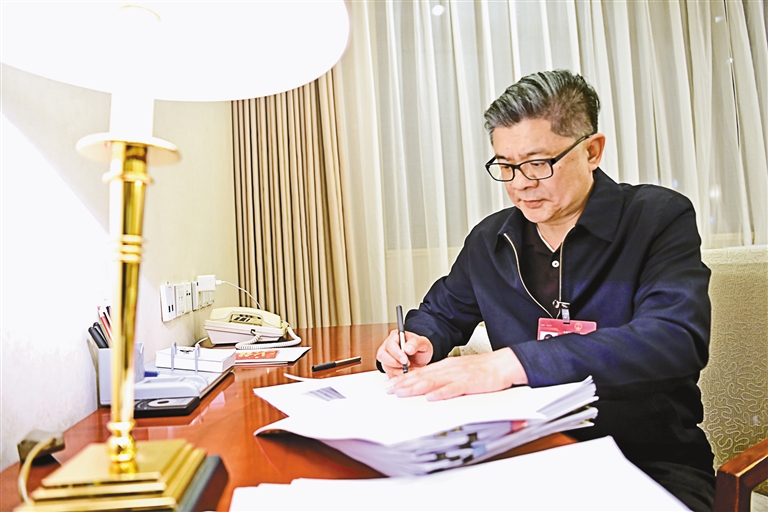 圖為全國人大代表王強在駐地整理發(fā)言材料。記者 旦增西旦 攝