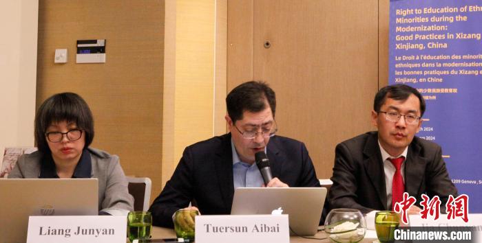 聯(lián)合國人權理事會第55屆會議期間,中國人權研究會當?shù)貢r間14日在瑞士日內(nèi)瓦舉辦“現(xiàn)代化發(fā)展中的少數(shù)民族受教育權——以中國西藏和新疆為例”主題邊會。 圖為中國人權研究會副秘書長王琰文(圖左)主持邊會。 中新社記者 德永健 攝