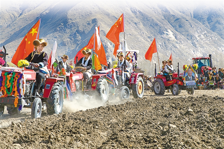 儀式中,從傳統(tǒng)的“二牛抬杠”耕作到手扶耕地機半自動犁地,再到大型旋耕機高效率深翻作業(yè),村民們用三種春耕方式依次展現(xiàn)了高原農(nóng)業(yè)生產(chǎn)的現(xiàn)代化、機械化發(fā)展過程。