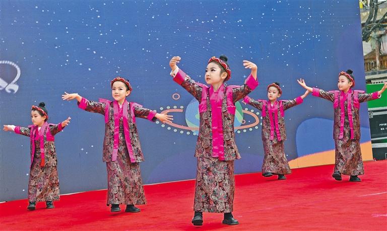 3月26日,拉薩市城關(guān)區(qū)吉崩崗街道黨工委組織街道各社區(qū)和轄區(qū)企事業(yè)單位開(kāi)展“農(nóng)奴翻身做主人 哈達(dá)獻(xiàn)給共產(chǎn)黨”主題文藝演出。圖為城關(guān)區(qū)第八幼兒園小朋友表演舞蹈《美麗的仁增旺姆》。記者 洛桑 唐斌 攝