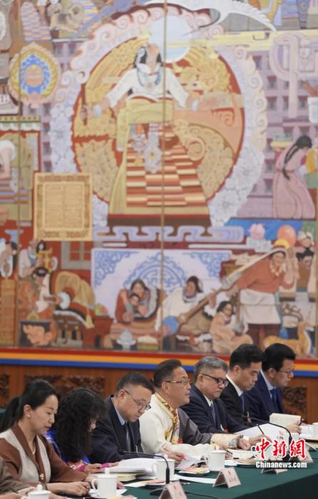 2024年3月6日,出席十四屆全國人大二次會議的西藏代表團(tuán)在北京人民大會堂西藏廳舉行開放團(tuán)組會議,審議政府工作報(bào)告并回答記者提問。崔楠 攝