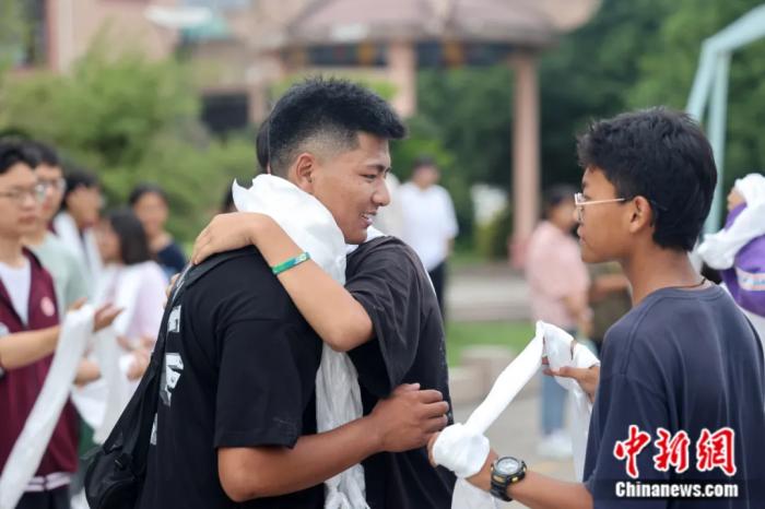 2022年6月,江蘇省南通市,南通西藏民族中學(xué)高三畢業(yè)生在離別前與校友告別。徐培欽 攝