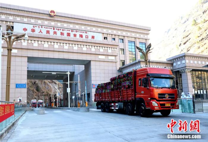 貨車駛?cè)胛挥谖鞑刈灾螀^(qū)吉隆縣的吉隆口岸。吉隆融媒體中心 供圖