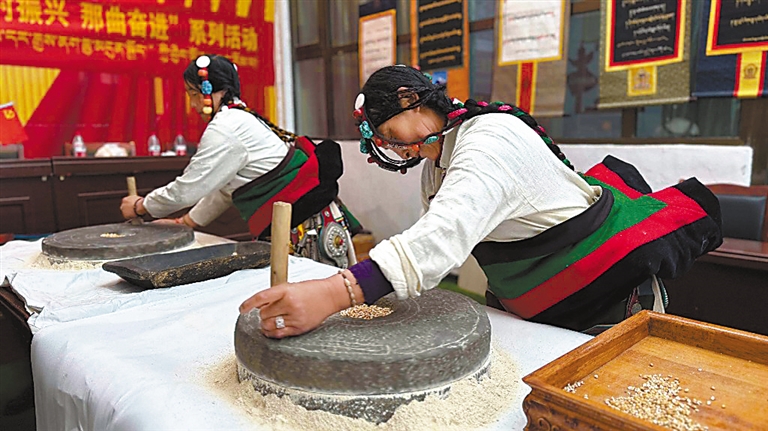 圖為在第三屆“鄉(xiāng)村振興 那曲奮進”農(nóng)牧民技能大賽中,巴青縣農(nóng)牧民參賽選手進行手工磨糌粑。記者 萬靖 攝