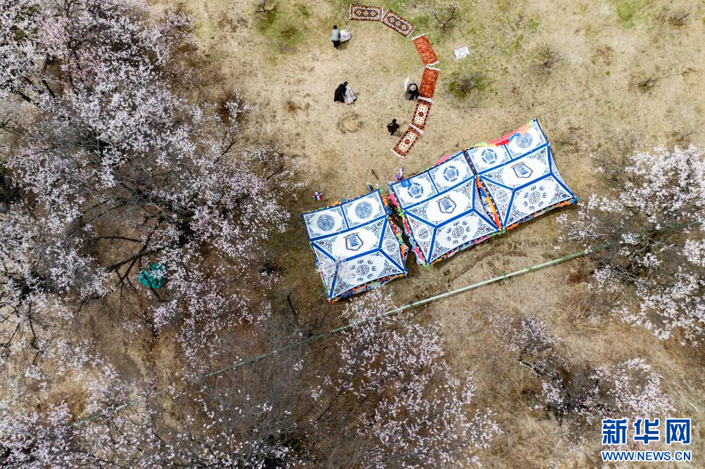 4月3日,群眾在林芝市巴宜區(qū)嘎拉村桃花間準(zhǔn)備 “過林卡”(無人機(jī)照片)。新華網(wǎng) 旦增努布 攝