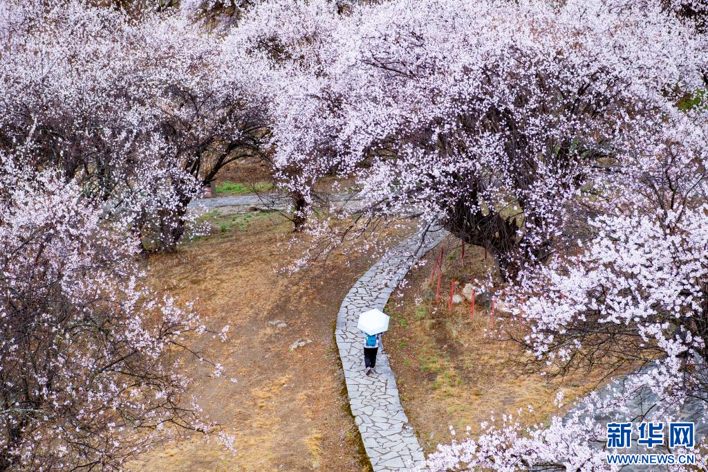 4月3日,游客行走在林芝市巴宜區(qū)嘎拉村的桃花園里。新華網(wǎng) 旦增努布 攝