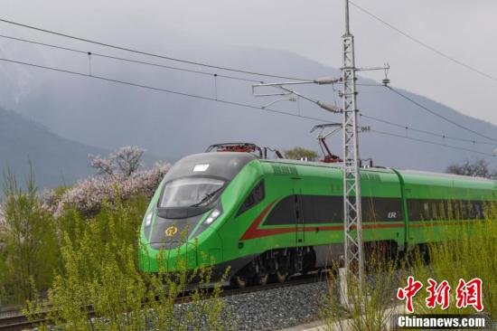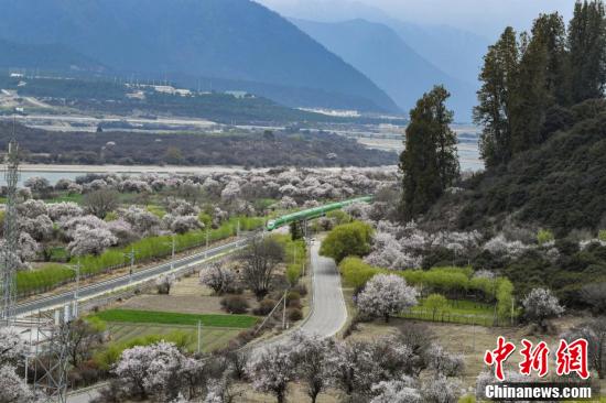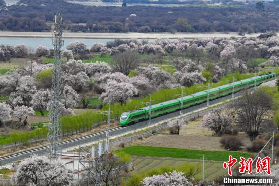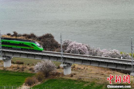 復(fù)興號(hào)動(dòng)車組不僅是一種便捷的交通方式,更成為了一種獨(dú)特的旅游體驗(yàn),讓游客能夠近距離欣賞到西藏林芝春季獨(dú)特的自然美景。圖為穿梭在桃花林中的拉林鐵路高原復(fù)興號(hào)。