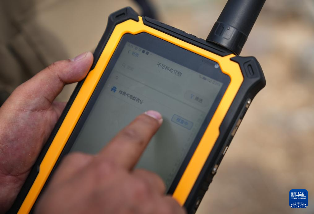 4月11日,普查人員手持移動端數(shù)據(jù)采集設備在曲果崗塔群遺址現(xiàn)場開展數(shù)據(jù)采集。新華社記者 晉美多吉 攝